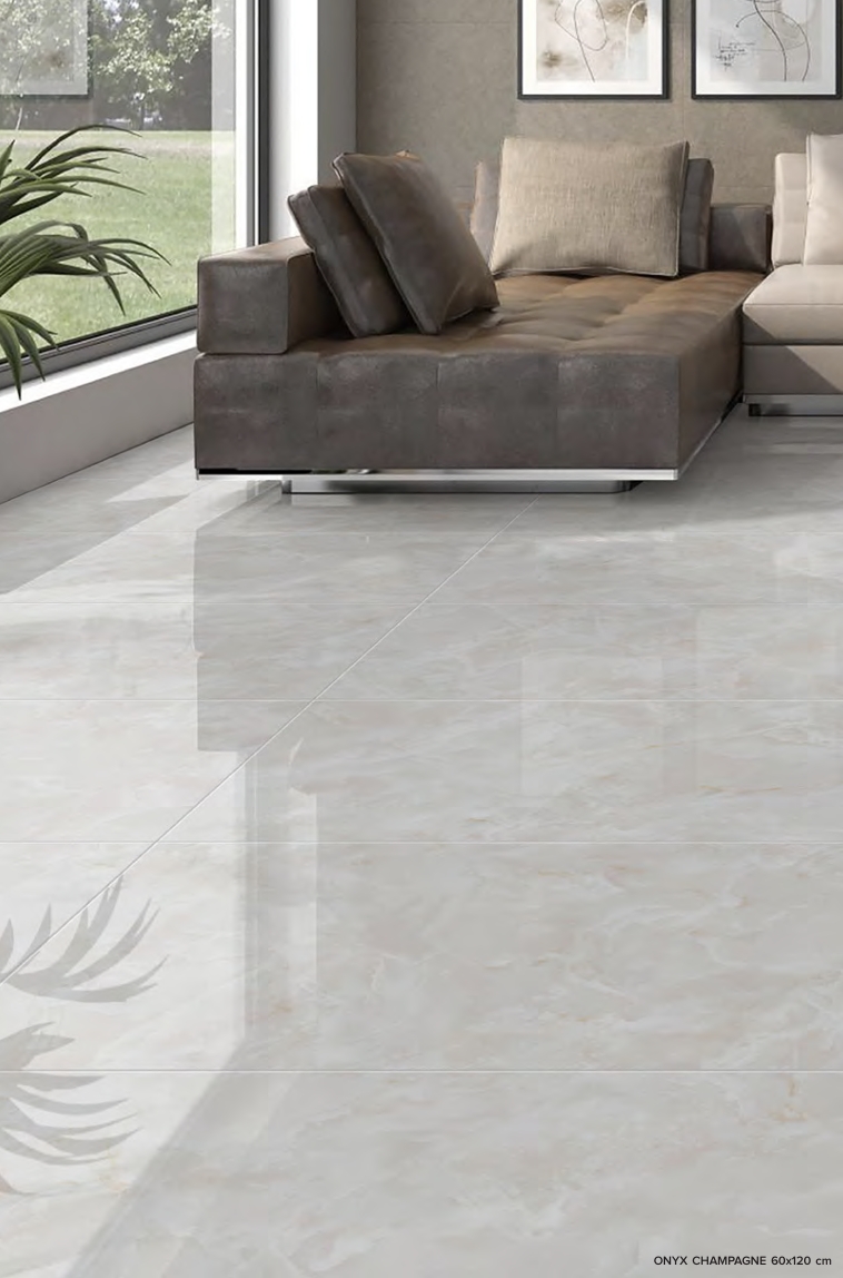 Die Fliese Onyx Champagne aus glasiertem Feinsteinzeug besticht durch ihre elegante, champagnefarbene Tönung mit dezenten, natürlichen Mustern. Sie verleiht jedem Raum eine warme, luxuriöse Atmosphäre und sorgt für ein stilvolles Ambiente. Die glatte, glänzende Oberfläche macht die Fliese nicht nur optisch ansprechend, sondern auch pflegeleicht und langlebig. Ob im Badezimmer, in der Küche oder im Wohnbereich – Onyx Champagne schafft eine helle und elegante Raumgestaltung, die zeitlos schön ist.
